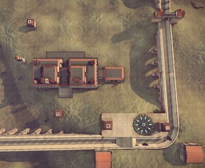 The bases are mirror images of each other and appear to be Itailan styled Villas that have high tech basements. The Generator is located in the center of the basement with storage rooms on either side. The flag-stand is on the roof and can be accessed from four directions, two through hallways. There are two Base Turrets on towers; one in front of the villa and the other behind near the Vehicle Pad. The Radar Sensor is behind the main structure, between it and the aquaduct. There is one Inventory Station inside the base, one near the vehicle pad, and one far out on a hillside away from the main base.