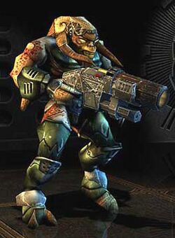 The BioDerm Hordes are genetically engineered lifeforms originally created by mankind as laborers and HERC pilots. They rebelled against their human creators and took control of their own genetic codes, breeding themselves into better warriors. The BioDerms were a playable "tribe" and the primary antagonists in Tribes 2. In Tribes: Ascend you can purchase 3 Voice Packs that replaces the default VGS voice with a BioDerm's voice, also the Raider class' Griever skin has a BioDerm skull on it's shoulder pad and the description of the TNC4 Rockwind SMG says it can drop a BioDerm.