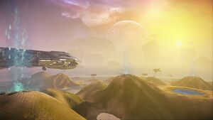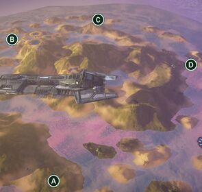 The terrain here looks similar to the archipelago on Crossfire. There are many small hills and shallow water all around. Some hills have geysers shooting out the tops which can give players a boost. There are sulfur pools in various places as well. The map features one ship, but players cannot enter it. Inventory Stations are scattered around the landscape.